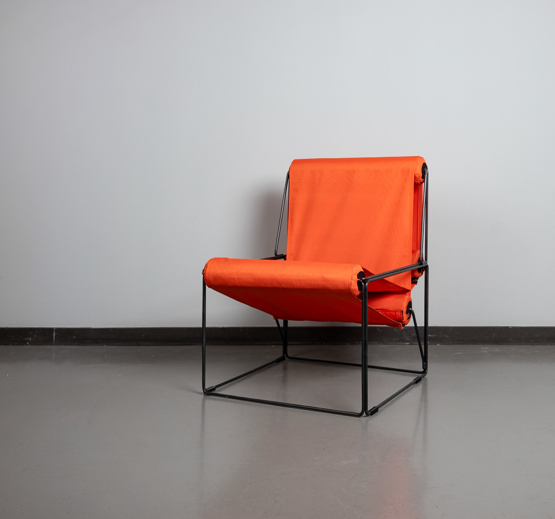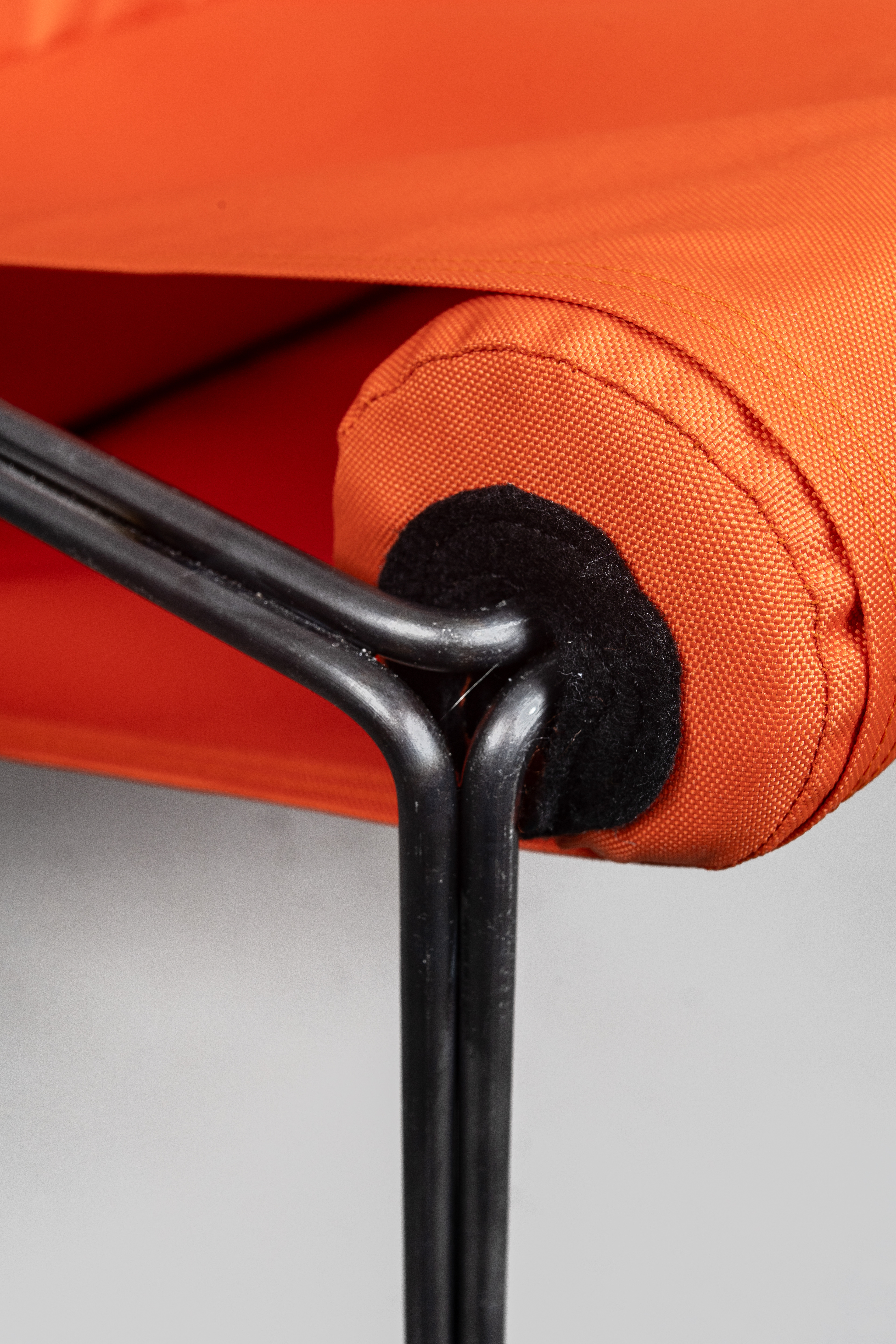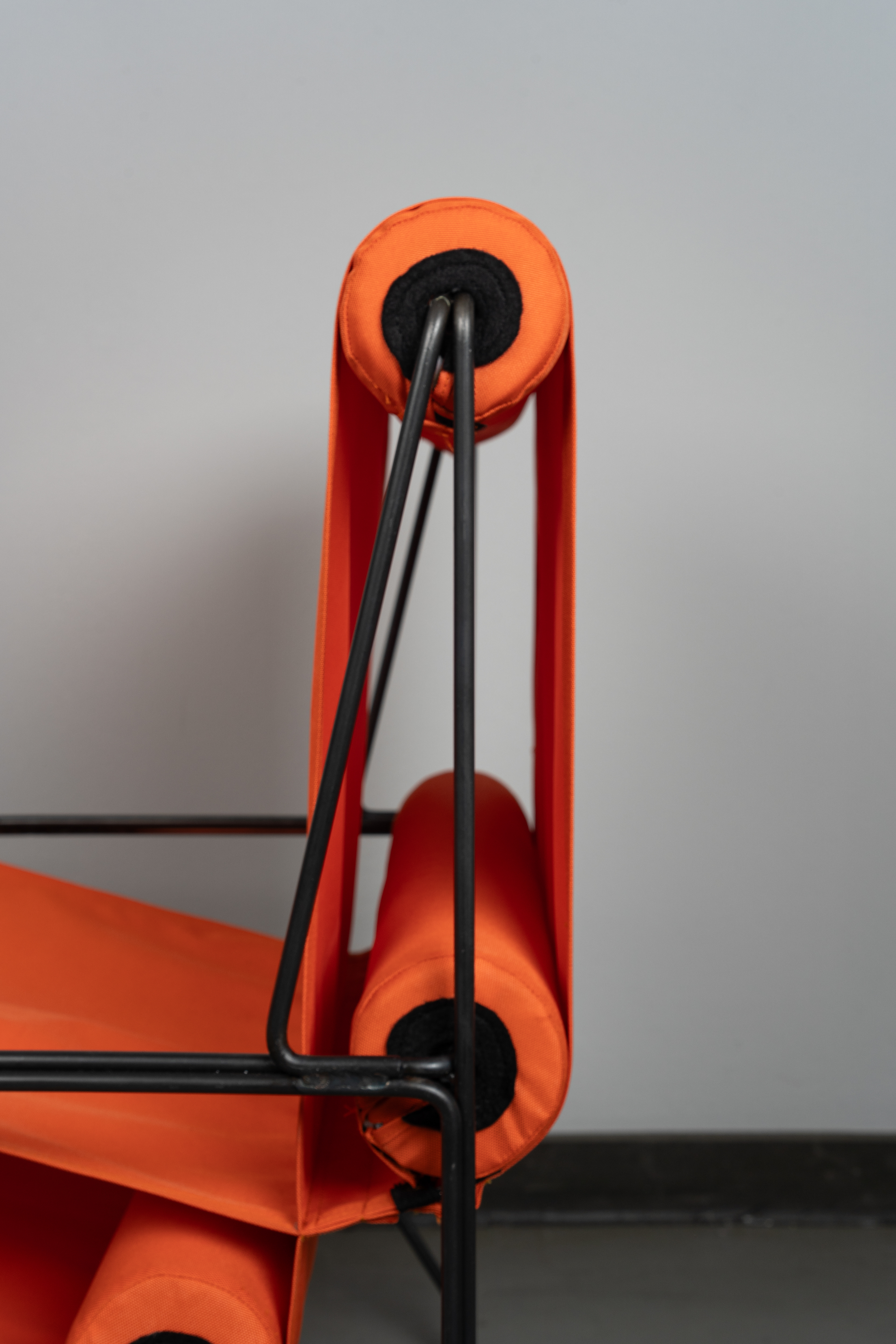 Der Stuhl „90c“ erhält seinen einzigartigen Charakter durch die Kombination aus den rechten Winkeln des Gestells, den vier runden Polsterrollen und der förderbandartigen Sitz- und Rückenlehne. Dazu fällt der Kontrast von dem knallig orangenen Stoff mit dem dunklen Gestell auf.