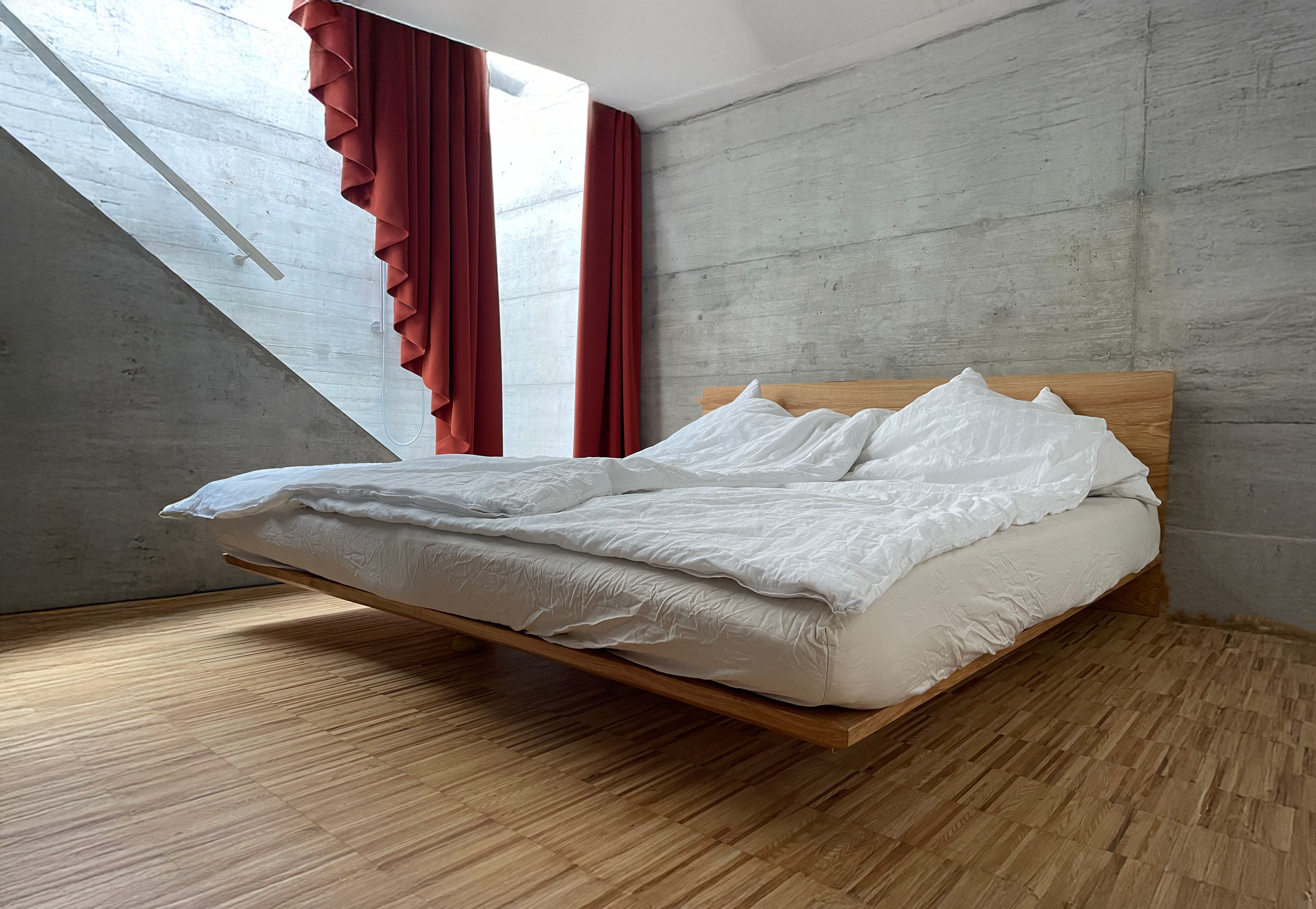 Das Bett „Janna“ ist ein reduziertes Gestell wie ein Tablet für die Matratze – leicht und funktional. Schweizer Kante und eingesetzte Füße sorgen für schwebende Optik, die flächige Rückwand für stabilen Kontrast.