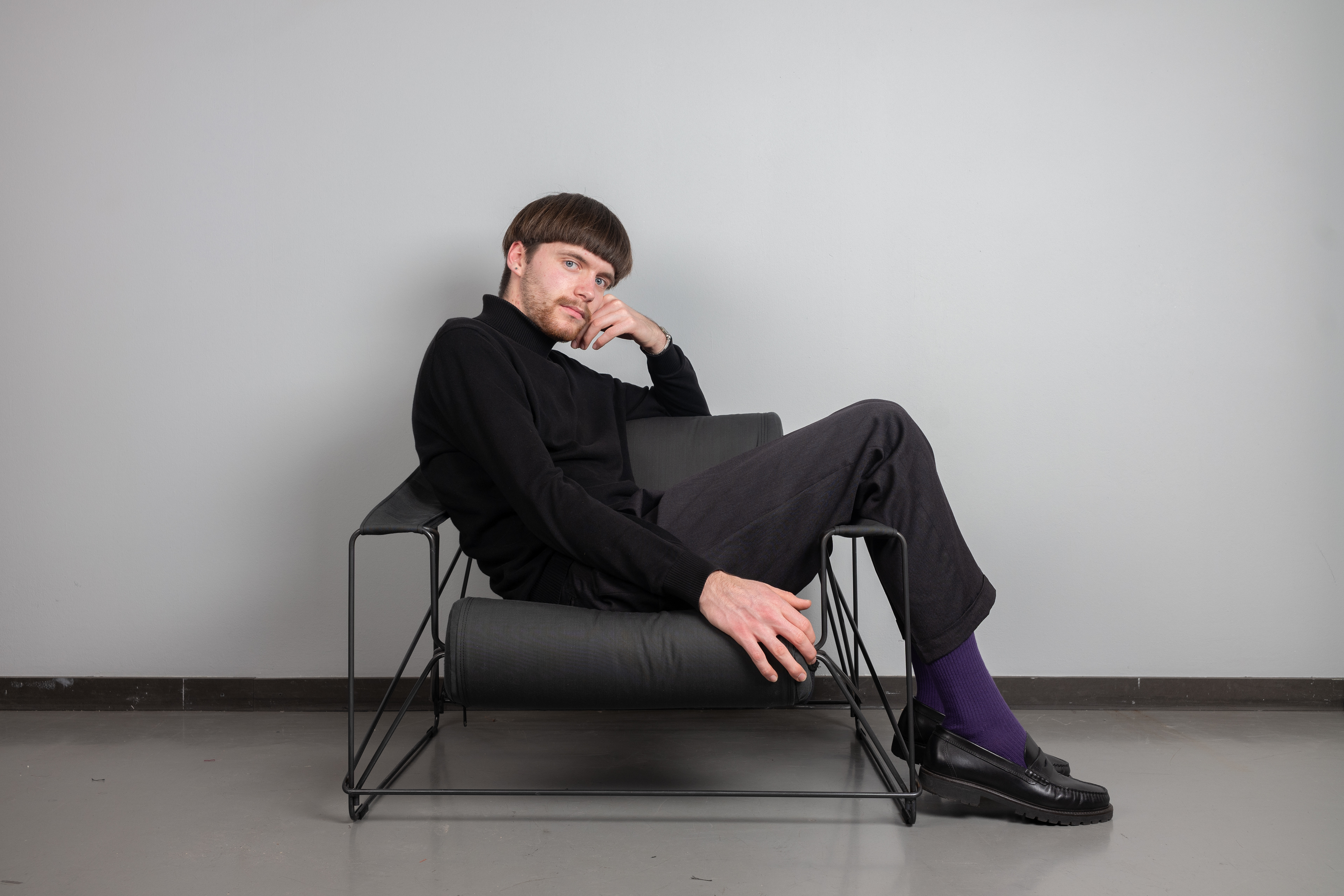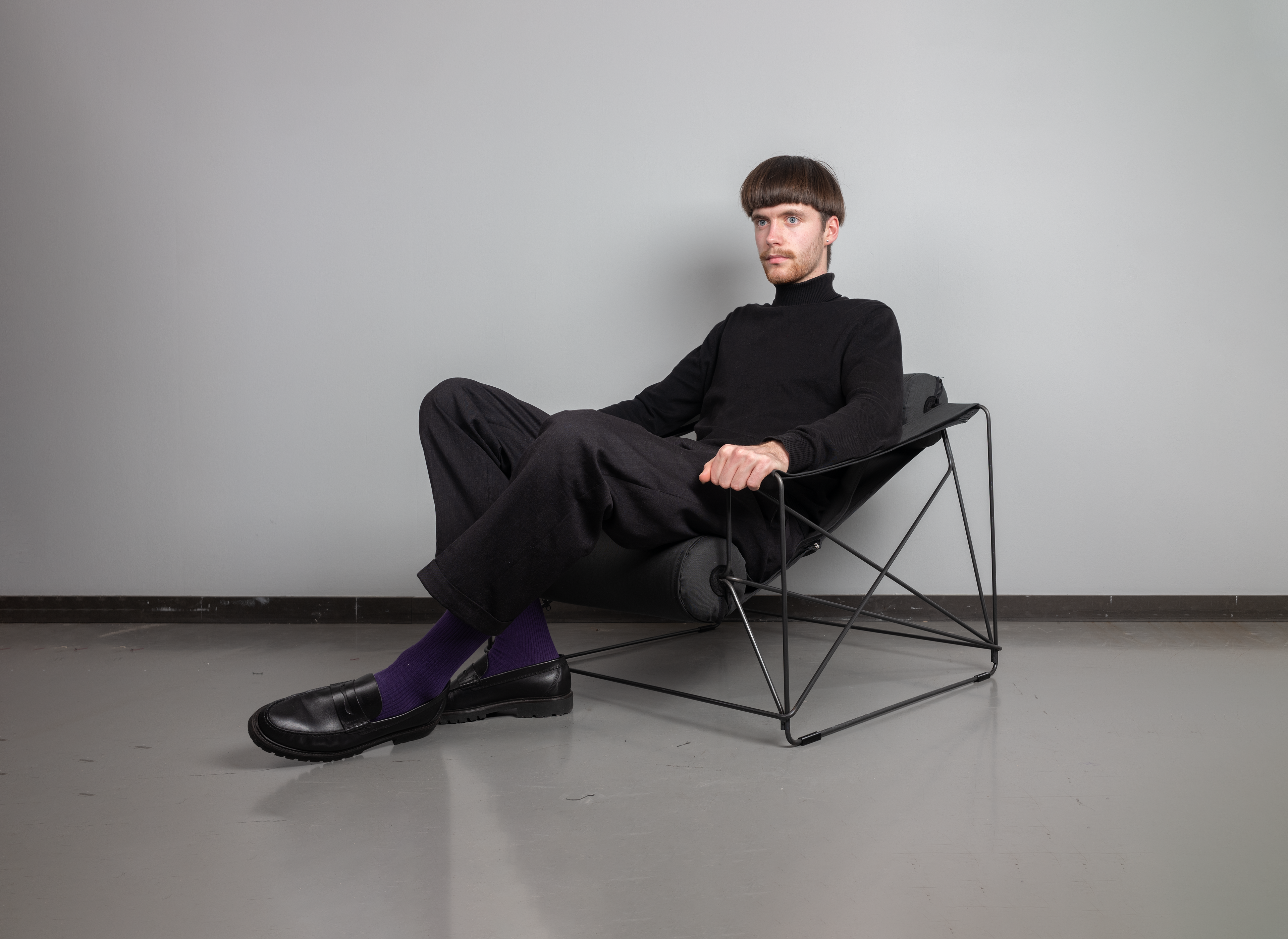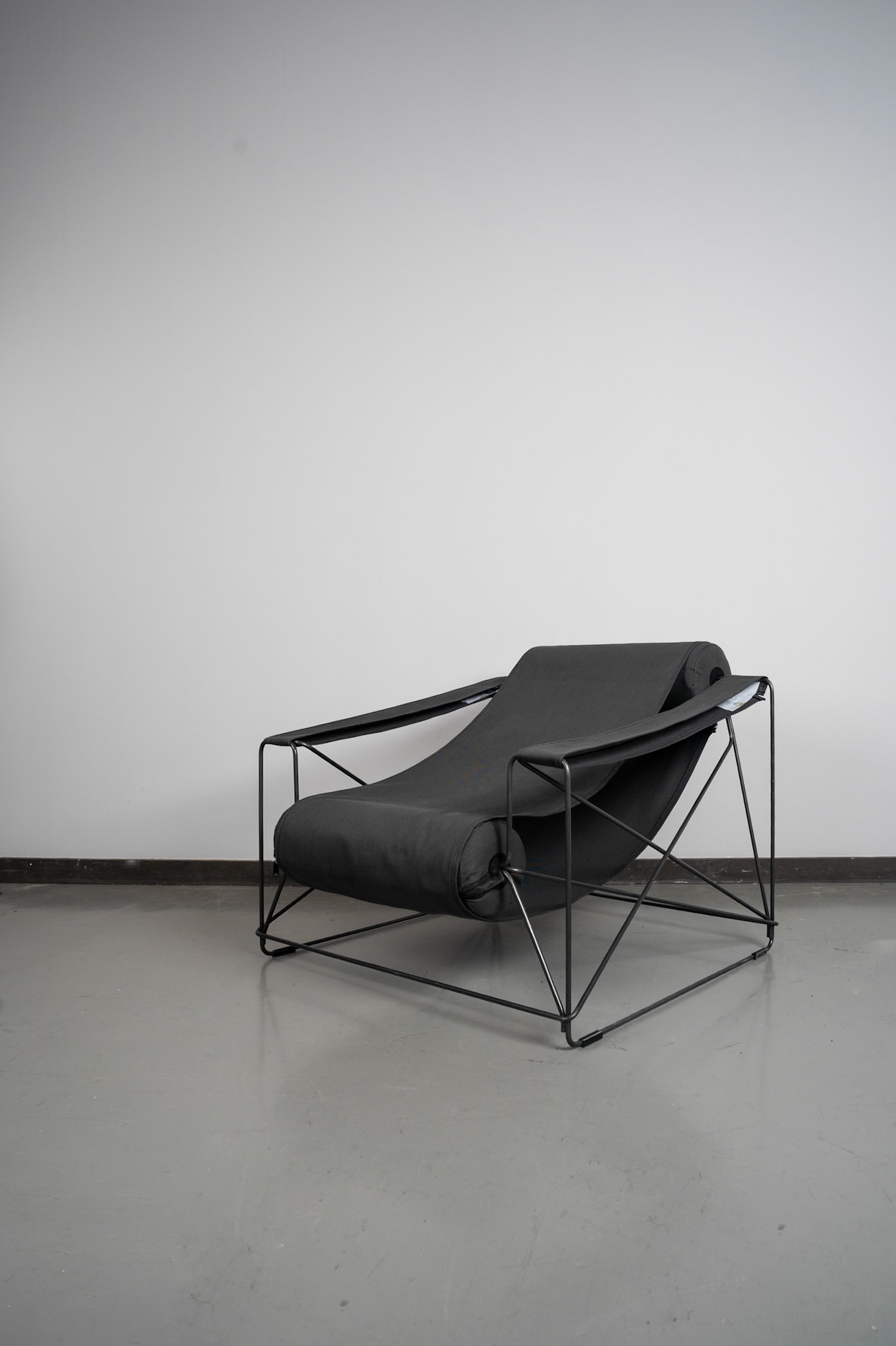 Der lounge-chair „rool“ besticht durch seine markante architektonische Gestaltung. Die beiden durch ein Stoffband miteinander verbundenen, drehbaren Rollen formen sowohl die Sitzfläche als auch die Rückenlehne. Diese passt sich ergonomisch an den Rücken an.